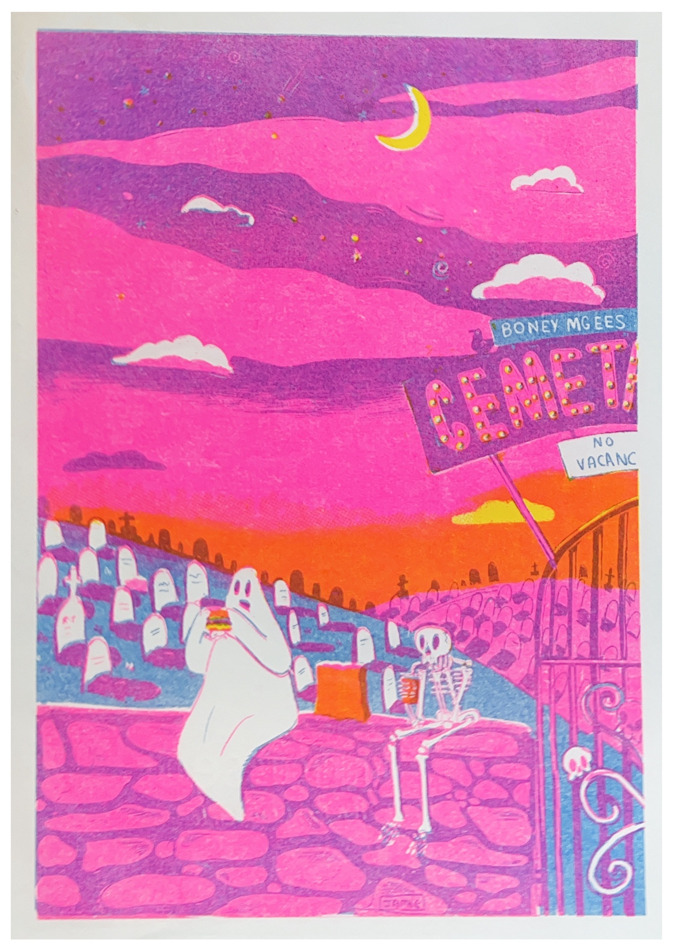 Just a couple of dudes chilling at Boneyâs place with their take-outs. (Boney, thatâs not how you spell âCemeteryâ, silly bones)